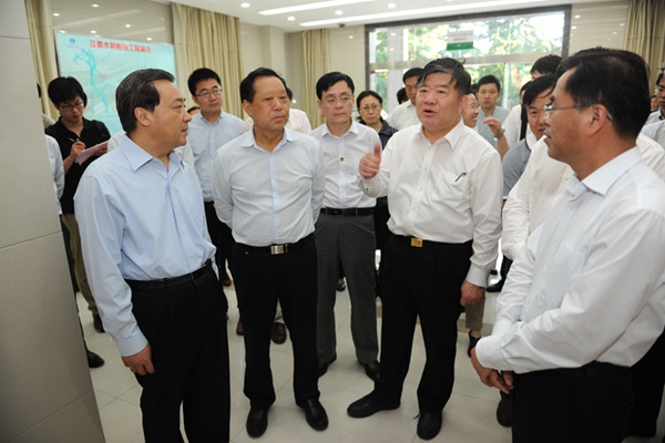 2015年5月21日,农工党中央主席陈竺、常务副主席刘晓峰一行考察南水北调东线工程江都水利枢纽工程并与工作人员交流