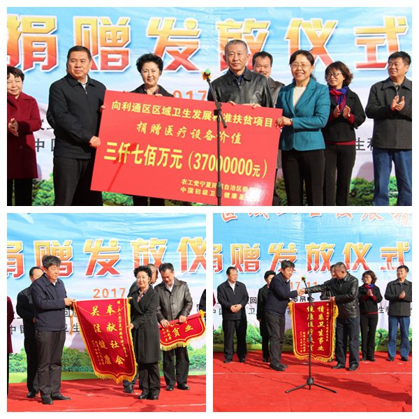 2017年11月9日,农工党宁夏区委会联合中国初级卫生保健基金会开展“区域卫生发展精准扶贫项目”的医疗设备捐赠仪式在吴忠市利通区举行。农工党宁夏区委会主委戴秀英、中国初级卫生保健基金会副秘书长李宝金、自治区党委统战部副部长、工商联党组书记魏莉、自治区卫计委副主任王生林及自治区扶贫办相关领导出席捐赠仪式。