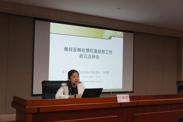 耿丽丽以《凝心聚力献良策 履职建言促发展》为题,围绕参政议政工作的重要性、农工党参政议政工作所取得的成绩和影响力、如何撰写提案等作讲座。农工党中央参政议政部社情民意信息处副处长刘晓蕾以《做好反映社情民意信息工作的几点体会》为题,围绕社情民意信息的作用、社情民意信息的搜集整理和编写等作了可操作性很强的讲座。