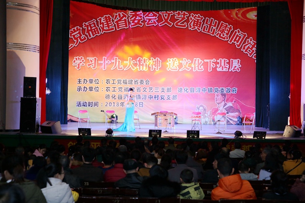 1月8日晚的德化,阴雨绵绵,气温骤降,但在德化县影剧院内,却是暖意融融。由农工党福建省委会主办,由农工党福建省文艺三支部、德化县浔中镇党委政府和德化县浔中镇浔中村党支部联合承办的“文艺演出慰问”活动在县影剧院内隆重举行。来自农工党福建省文艺一支部、二支部和三支部(福建京剧院、福建省杂技团和福建省歌舞剧院)的党员专家为冒雨前来观看演出的500多位群众带来了16个精彩的节目。专家们的表演既有女声独唱和京剧清唱,又有器乐独奏和合奏,还有树叶吹奏和魔术表演,精彩纷呈,雅俗共赏,观演群众不时鼓掌叫好,活动取得圆满成功,得到了当地党委政府的肯定和好评,彰显了农工党福建省委会文化下乡社会服务的良好品牌效应。