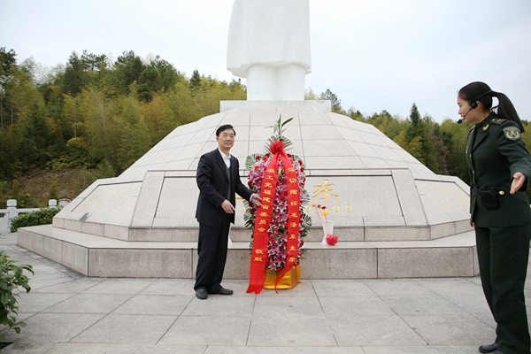 在古田会议会址北侧的毛主席纪念园,学员们向毛泽东同志雕像敬献花篮,面向雕像鞠躬并缓步绕雕像一周,表达对毛泽东同志的崇敬和怀念之情。