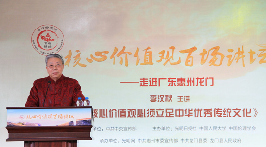 “中国哲学是伦理型的,伦理道德是中华传统文化的核心和优长。”在题为《培育核心价值观必须立足传统文化》的演讲中,人文科学学者李汉秋提出,继承发扬优秀传统文化,现代应优先建设三大人伦关系:亲子关系(血缘伦理)、夫妻关系(婚姻伦理)、师生关系(代表层级伦理),具体而言可落实到亲子爱、夫妻情、师生义。12月5日,“核心价值观百场讲坛”第十一场在广东省惠州市龙门县开讲,主讲嘉宾李汉秋旁征博引,讲述了伦理道德在传统文化中的精髓地位。